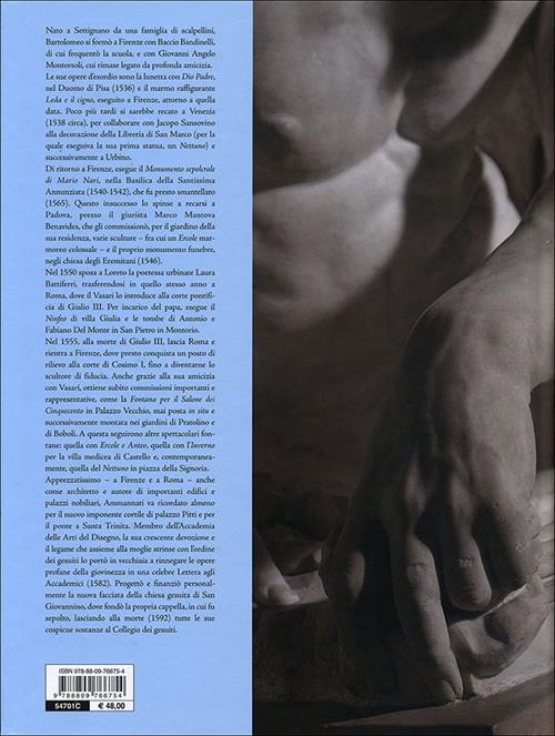 Il volume è il catalogo della mostra di Firenze (Museo Nazionale del Bargello, 11 maggio-18 settembre 2011). Nato a Settignano da una famiglia di scalpellini, l'Ammannati si forma a Firenze con Baccio Bandinelli, di cui frequenta la scuola, e con Giovanni Angelo Montorsoli, cui rimane legato da profonda amicizia. Nel 1550 sposa a Loreto la poetessa urbinate Laura Battiferri, trasferendosi in quello stesso anno a Roma, dove il Vasari lo introduce alla corte pontificia di Giulio III. Nel 1555 rientra a Firenze, dove presto conquista un posto di rilievo alla corte di Cosimo I, fino a diventarne lo scultore di fiducia. Apprezzatissimo - a Firenze e a Roma anche come architetto e autore di importanti edifici e palazzi nobiliari, Ammannati va ricordato almeno per il nuovo imponente cortile di palazzo Pitti e per il ponte a Santa Trinità.