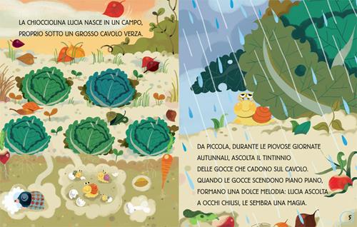 Lucia è una chiocciolina che vive in un bel campo di verze. Intorno a lei si muovono gli animali della fattoria e risuonano i rumori della natura. Un bel giorno decide di provare a unire quei suoni differenti e renderli armoniosi. Sì, è piccola, nessuno le dà credito, ma ciò nonostante è fermamente decisa a formare un’orchestra e organizzare un favoloso concerto! Libro realizzato con criteri accessibili per facilitare la lettura. Età di lettura: da 5 anni.