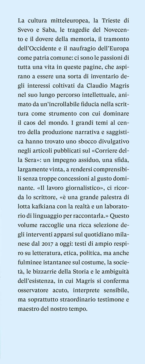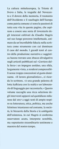 La cultura mitteleuropea, la Trieste di Svevo e Saba, le tragedie del Novecento e il dovere della memoria, il tramonto dell'Occidente e il naufragio dell'Europa come patria comune: ci sono le passioni di tutta una vita in queste pagine, che aspirano a essere una sorta di inventario degli interessi coltivati da Claudio Magris nel suo lungo percorso intellettuale, animato da un'incrollabile fiducia nella scrittura come strumento con cui dominare il caos del mondo. I grandi temi al centro della produzione narrativa e saggistica hanno trovato uno sbocco divulgativo negli articoli pubblicati sul «Corriere della Sera»: un impegno assiduo, una sfida, largamente vinta, a rendersi comprensibili senza troppe concessioni al gusto dominante. «Il lavoro giornalistico», ci ricordalo scrittore, «è una grande palestra di lotta kafkiana con la realtà e un laboratorio di linguaggio per raccontarla».