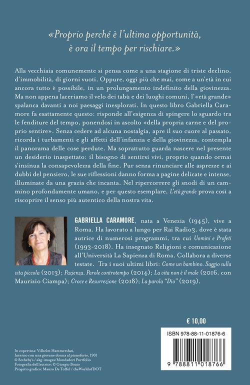 Alla vecchiaia comunemente si pensa come a una stagione di triste declino, d'immobilità, di giorni vuoti. Oppure, oggi più che mai, come a un'età in cui ancora tutto è possibile, in un prolungamento indefinito della giovinezza. Ma non appena laceriamo il velo dei tabù e dei luoghi comuni, l'«età grande» spalanca davanti a noi paesaggi inesplorati. Nel suo nuovo libro Gabriella Caramore fa esattamente questo: risponde all'esigenza di spingere lo sguardo tra le fenditure del tempo, ponendosi in ascolto «della propria carne e del proprio sentire». Senza cedere a nessuna nostalgia, apre il suo cuore al passato, ricorda i turbamenti e gli affetti dell'infanzia e della giovinezza, contempla il panorama delle cose perdute. Ma soprattutto guarda nascere nel presente un desiderio inaspettato: il bisogno di sentirsi vivi, proprio quando ormai s'insinua la consapevolezza della fine. Pur senza rinunciare alle asprezze e ai dubbi del pensiero, le sue riflessioni danno forma a pagine delicate e intense, illuminate da una grazia che incanta. Nel ripercorrere gli snodi di un cammino profondamente umano, e per questo esemplare, "L'età grande" prova così a riscoprire il senso più autentico della nostra vita.