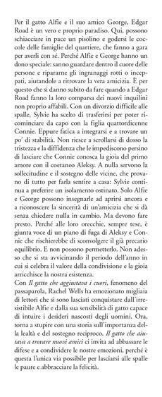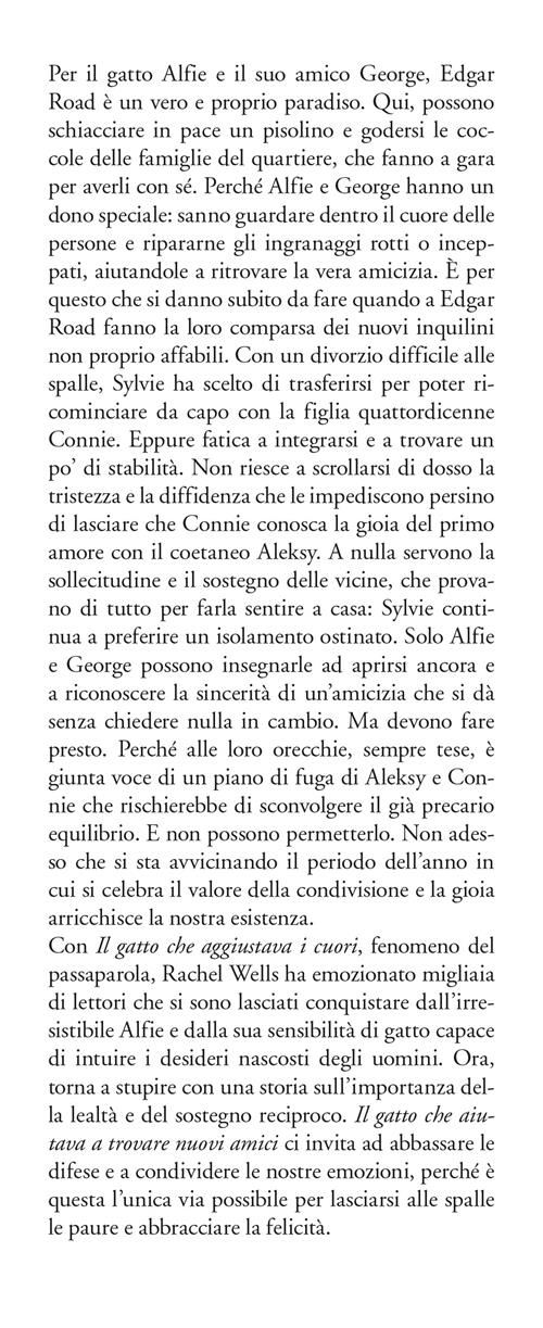 Per il gatto Alfie e il suo amico George, Edgar Road è un vero e proprio paradiso. Qui, possono schiacciare in pace un pisolino e godersi le coccole delle famiglie del quartiere, che fanno a gara per averli con sé. Perché Alfie e George hanno un dono speciale: sanno guardare dentro il cuore delle persone e ripararne gli ingranaggi rotti o inceppati, aiutandole a ritrovare la vera amicizia. È per questo che si danno subito da fare quando a Edgar Road fanno la loro comparsa dei nuovi inquilini non proprio affabili. Con un divorzio difficile alle spalle, Sylvie ha scelto di trasferirsi per poter ricominciare da capo con la figlia quattordicenne Connie. Eppure fatica a integrarsi e a trovare un po’ di stabilità. Non riesce a scrollarsi di dosso la tristezza e la diffidenza che le impediscono persino di lasciare che Connie conosca la gioia del primo amore con il coetaneo Aleksy. A nulla servono la sollecitudine e il sostegno delle vicine, che provano di tutto per farla sentire a casa: Sylvie continua a preferire un isolamento ostinato. Solo Alfie e George possono insegnarle ad aprirsi ancora e a riconoscere la sincerità di un’amicizia che si dà senza chiedere nulla in cambio. Ma devono fare presto. Perché alle loro orecchie, sempre tese, è giunta voce di un piano di fuga di Aleksy e Connie che rischierebbe di sconvolgere il già precario equilibrio. E non possono permetterlo. Non adesso che si sta avvicinando il periodo dell’anno in cui si celebra il valore della condivisione e la gioia arricchisce la nostra esistenza.