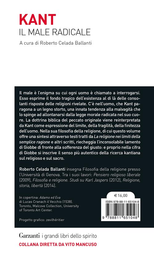 Il male è l'enigma su cui ogni uomo è chiamato a interrogarsi e che esprime il fondo tragico dell'esistenza al di là delle consolanti risposte delle religioni rivelate. C'è nell'uomo, che Kant paragona a un legno storto, una innata e insopprimibile inclinazione alla malvagità che lo spinge ad allontanarsi dalla legge morale profondamente radicata nel suo cuore. La dottrina biblica del peccato originale, il "Tutti abbiamo peccato in Adamo" della Lettera ai Romani di Paolo di Tarso, vengono reinterpretati da Kant in chiave filosofica come espressione del limite, della fragilità, della finitezza dell'uomo. Nella filosofia della religione di Kant riecheggia l'inconsolabile lamento di Giobbe di fronte alla sofferenza del giusto: e proprio nella cifra di Giobbe si inscrive il senso più autentico della ricerca kantiana sul religioso e sul sacro.