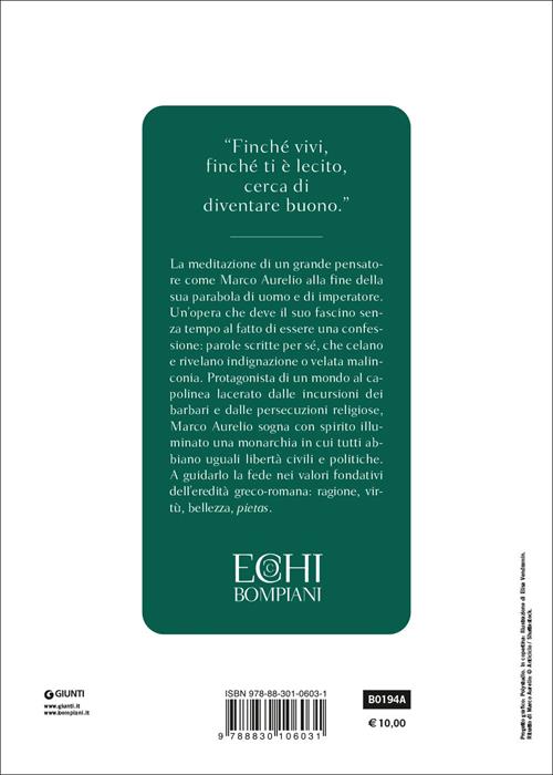 La meditazione di un grande pensatore come Marco Aurelio alla fine della sua parabola di uomo e di imperatore. Un'opera che deve il suo fascino senza tempo al fatto di essere una confessione: parole scritte per sé, che celano e rivelano indignazione o velata malinconia. Protagonista di un mondo al capolinea lacerato dalle incursioni dei barbari e dalle persecuzioni religiose, Marco Aurelio sogna con spirito illuminato una monarchia in cui tutti abbiano uguali libertà civili e politiche. A guidarlo la fede nei valori fondativi dell'eredità greco-romana: ragione, virtù, bellezza, pietas.