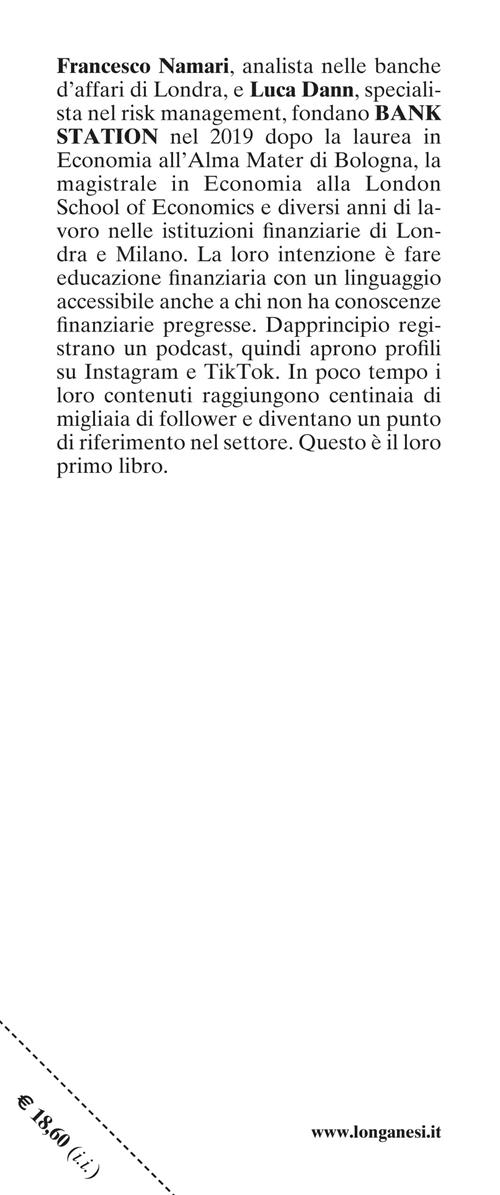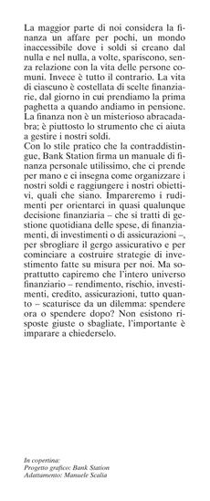 La maggior parte di noi considera la finanza un affare per pochi, un mondo inaccessibile dove i soldi si creano dal nulla e nel nulla, a volte, spariscono, senza relazione con la vita delle persone comuni. Invece è tutto il contrario. La vita di ciascuno è costellata di scelte finanziarie, dal giorno in cui prendiamo la prima paghetta a quando andiamo in pensione. La finanza non è un misterioso abracadabra; è piuttosto lo strumento che ci aiuta a gestire i nostri soldi. Con lo stile pratico che la contraddistingue, Bank Station firma un manuale di finanza personale utilissimo, che ci prende per mano e ci insegna come organizzare i nostri soldi e raggiungere i nostri obiettivi, quali che siano. Impareremo i rudimenti per orientarci in quasi qualunque decisione finanziaria – che si tratti di gestione quotidiana delle spese, di finanziamenti, di investimenti o di assicurazioni –, per sbrogliare il gergo assicurativo e per cominciare a costruire strategie di investimento fatte su misura per noi. Ma soprattutto capiremo che l’intero universo finanziario – rendimento, rischio, investimenti, credito, assicurazioni, tutto quanto – scaturisce da un dilemma: spendere ora o spendere dopo? Non esistono risposte giuste o sbagliate, l’importante è imparare a chiederselo.