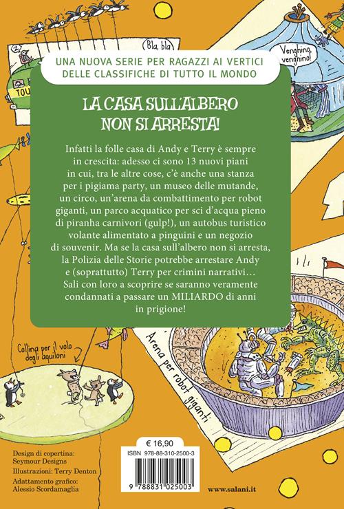 Infatti la folle casa di Andy e Terry è sempre in crescita: adesso ci sono 13 nuovi piani in cui, tra le altre cose, c'è anche una stanza per i pigiama party, un museo delle mutande, un circo, un'arena da combattimento per robot giganti, un parco acquatico per sci d'acqua pieno di piranha carnivori (gulp!), un autobus turistico volante alimentato a pinguini e un negozio di souvenir. Ma se la casa sull'albero non si arresta, la Polizia delle Storie potrebbe arrestare Andy e (soprattutto) Terry per crimini narrativi… Sali con loro a scoprire se saranno veramente condannati a passare un miliardo di anni in prigione! Età di lettura: da 7 anni.