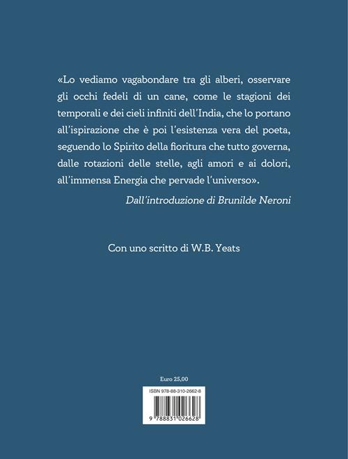 Perché leggere Tagore significa intrecciare la saggezza delle tradizioni orientali con una sensibilità universale, entrare in un tessuto di poesia che è canto, preghiera e meraviglia insieme, celebrare l’amore, la natura, il dialogo, il mistero della vita, la sacralità dell’esistenza quotidiana, l’anelito verso l’eternità del tempo e dell’universo attorno a noi. E scoprire come la sua voce riesca ancora oggi a parlare all’uomo contemporaneo con limpidezza e intensità. Un invito alla contemplazione e alla meraviglia, rivolto a chi cerca nella poesia non solo bellezza, ma anche pace e verità.