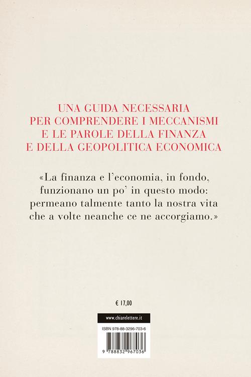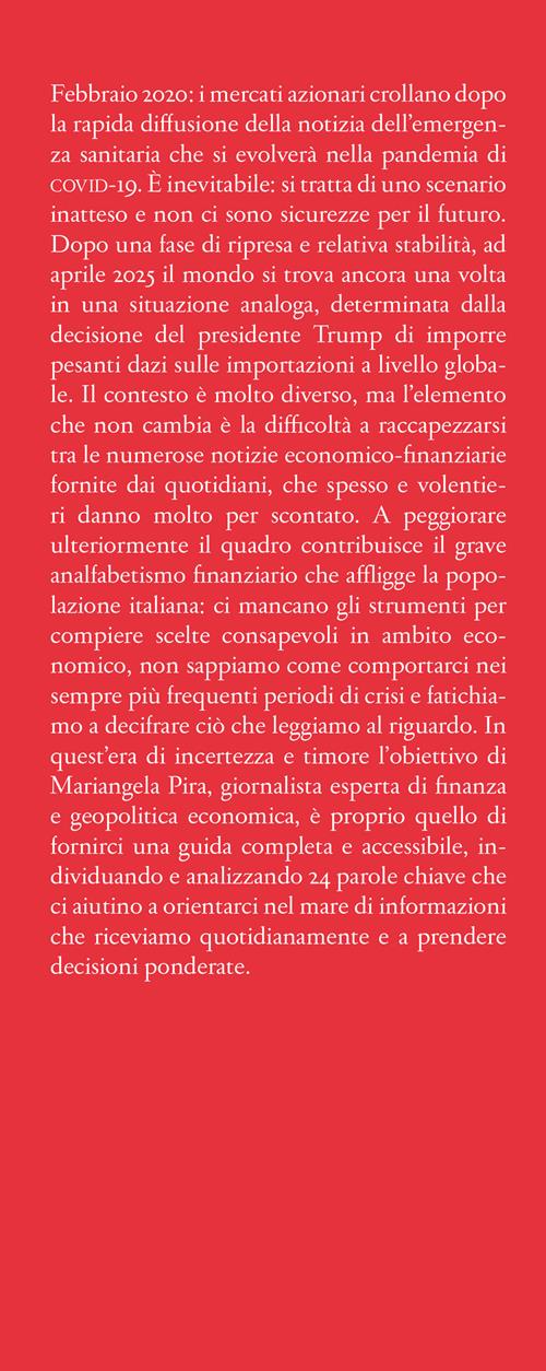 Febbraio 2020: i mercati azionari crollano dopo la rapida diffusione della notizia dell'emergenza sanitaria che si evolverà nella pandemia di covid-19. È inevitabile: si tratta di uno scenario inatteso e non ci sono sicurezze per il futuro. Dopo una fase di ripresa e relativa stabilità, ad aprile 2025 il mondo si trova ancora una volta in una situazione analoga, determinata dalla decisione del presidente Trump di imporre pesanti dazi sulle importazioni a livello globale. Il contesto è molto diverso, ma l'elemento che non cambia è la difficoltà a raccapezzarsi nelle numerose notizie economico-finanziarie fornite dai quotidiani, che spesso e volentieri danno molto per scontato. A peggiorare ulteriormente il quadro contribuisce il grave analfabetismo finanziario che affligge la popolazione italiana: ci mancano gli strumenti per compiere scelte consapevoli in ambito economico, non sappiamo come comportarci nei sempre più frequenti periodi di crisi e fatichiamo a decifrare ciò che leggiamo al riguardo. In quest'era di incertezza e timore l'obiettivo di Mariangela Pira, giornalista esperta di finanza e geopolitica economica, è proprio quello di fornirci una guida completa e accessibile, individuando e analizzando 24 parole chiave che ci aiutino a orientarci nel mare di informazioni che riceviamo quotidianamente e a prendere decisioni ponderate.
