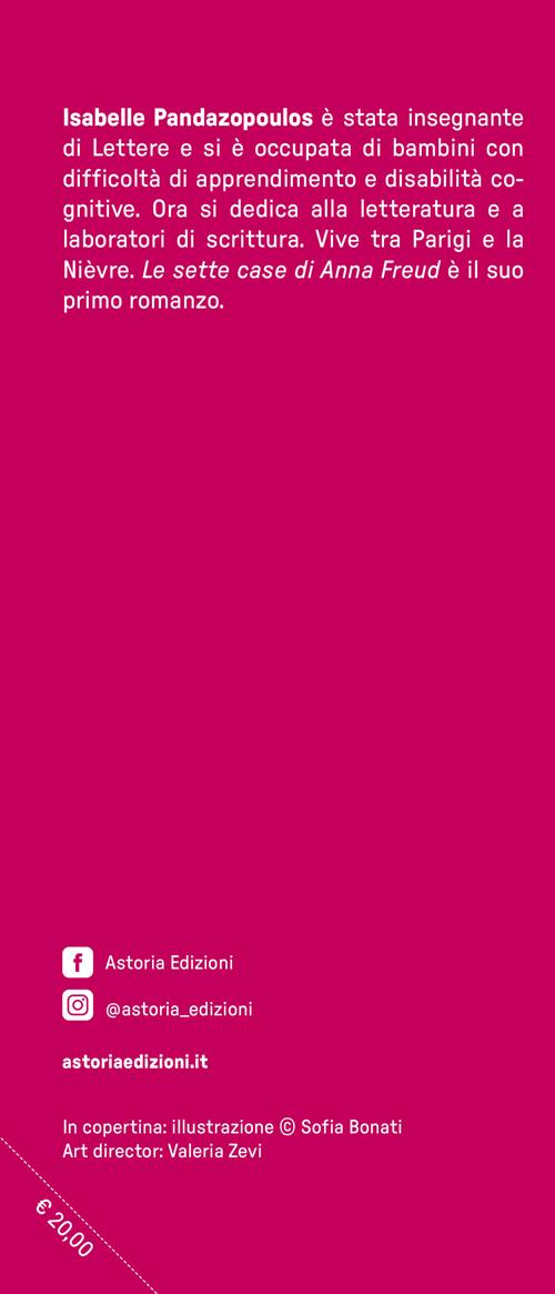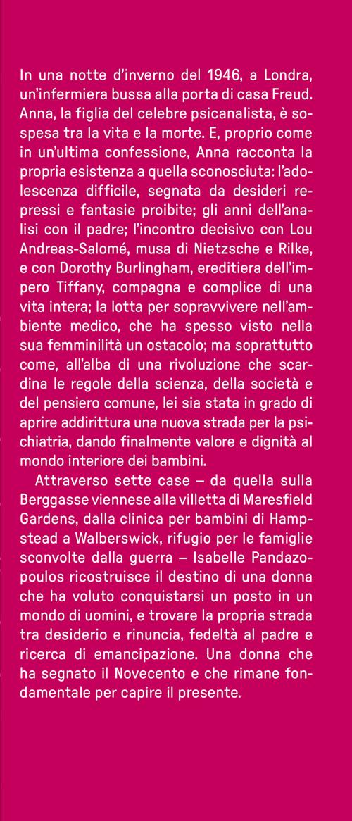 In una notte d'inverno del 1946, a Londra, un'infermiera bussa alla porta di casa Freud. Anna, la figlia del celebre psicanalista, è sospesa tra la vita e la morte. E, proprio come in un'ultima confessione, Anna racconta la propria esistenza a quella sconosciuta: l'adolescenza difficile, segnata da desideri repressi e fantasie proibite; gli anni dell'analisi con il padre; l'incontro decisivo con Lou Andreas-Salomé, musa di Nietzsche e Rilke, e con Dorothy Burlingham, ereditiera dell'impero Tiffany, compagna e complice di una vita intera; la lotta per sopravvivere nell'ambiente medico, che ha spesso visto nella sua femminilità un ostacolo; ma soprattutto come, all'alba di una rivoluzione che scardina le regole della scienza, della società e del pensiero comune, lei sia stata in grado di aprire addirittura una nuova strada per la psichiatria, dando finalmente valore e dignità al mondo interiore dei bambini. Attraverso sette case – da quella sulla Berggasse viennese alla villetta di Maresfield Gardens, dalla clinica per bambini di Hampstead a Walberswick, rifugio per le famiglie sconvolte dalla guerra – Isabelle Pandazopoulos ricostruisce il destino di una donna che ha voluto conquistarsi un posto in un mondo di uomini, e trovare la propria strada tra desiderio e rinuncia, fedeltà al padre e ricerca di emancipazione. Una donna che ha segnato il Novecento e che rimane fondamentale per capire il presente.