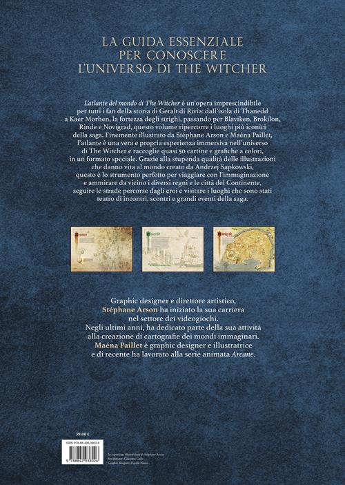 L’atlante del mondo di The Witcher è un’opera imprescindibile per tutti i fan della storia di Geralt di Rivia: dall’isola di Thanedd a Kaer Morhen, la fortezza degli strighi, passando per Blaviken, Brokilon, Rinde e Novigrad, questo volume ripercorre i luoghi più iconici della saga. Finemente illustrato da Stéphane Arson e Maéna Paillet, l’atlante è una vera e propria esperienza immersiva nell’universo di The Witcher e raccoglie quasi 50 cartine e grafiche a colori, in un formato speciale. Grazie alla stupenda qualità delle illustrazioni che danno vita al mondo creato da Andrzej Sapkowski, questo è lo strumento perfetto per viaggiare con l’immaginazione e ammirare da vicino i diversi regni e le città del Continente, seguire le strade percorse dagli eroi e visitare i luoghi che sono stati teatro di incontri, scontri e grandi eventi della saga.