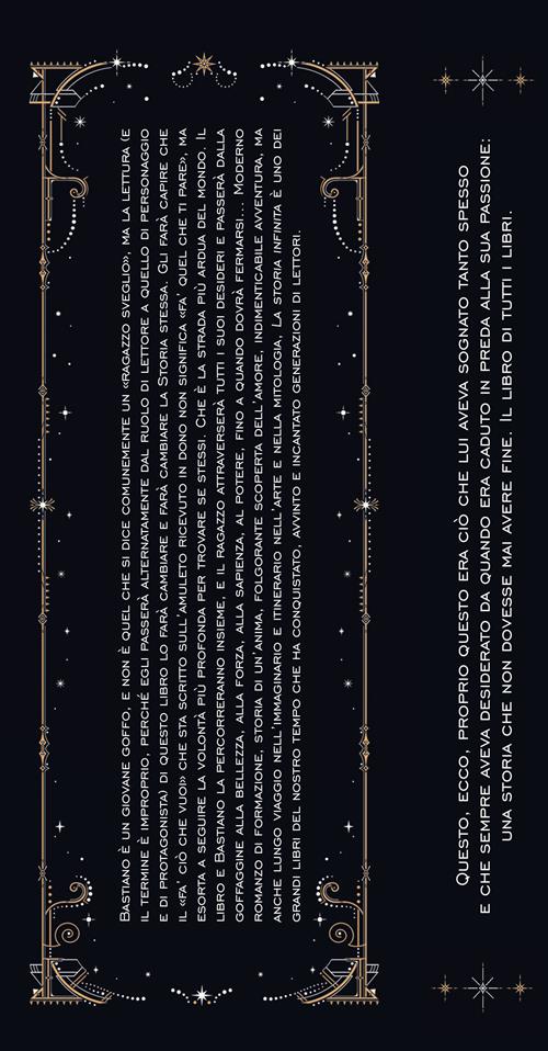 Il libro di tutti i libri. Bastiano è un giovane goffo, e non è quel che si dice comunemente un «ragazzo sveglio», ma la lettura (e il termine è improprio, perché egli passerà alternatamente dal ruolo di lettore a quello di personaggio e di protagonista) di questo libro lo farà cambiare e farà cambiare la Storia stessa. Gli farà capire che il «fà ciò che vuoi» che sta scritto sull’amuleto ricevuto in dono non significa «fà quel che ti pare», ma esorta a seguire la volontà più profonda per trovare se stessi. Che è la strada più ardua del mondo. Il libro e Bastiano la percorreranno insieme, e il ragazzo attraverserà tutti i suoi desideri e passerà dalla goffaggine alla bellezza, alla forza, alla sapienza, al potere, fino a quando dovrà fermarsi...