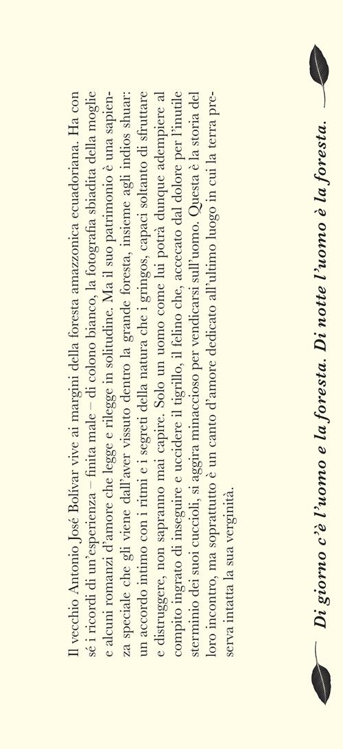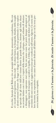 Di giorno c'è l'uomo e la foresta. Di notte l'uomo è la foresta. Il vecchio Antonio José Bolívar vive ai margini della foresta amazzonica ecuadoriana. Ha con sé i ricordi di un'esperienza – finita male – di colono bianco, la fotografia sbiadita della moglie e alcuni romanzi d'amore che legge e rilegge in solitudine. Ma il suo patrimonio è una sapienza speciale che gli viene dall'aver vissuto dentro la grande foresta, insieme agli indios shuar: un accordo intimo con i ritmi e i segreti della natura che i gringos, capaci soltanto di sfruttare e distruggere, non sapranno mai capire. Solo un uomo come lui potrà dunque adempiere al compito ingrato di inseguire e uccidere il tigrillo, il felino che, accecato dal dolore per l'inutile sterminio dei suoi cuccioli, si aggira minaccioso per vendicarsi sull'uomo. Questa è la storia del loro incontro, ma soprattutto è un canto d'amore dedicato all'ultimo luogo in cui la terra preserva intatta la sua verginità. Canto d'amore dedicato all'ultimo luogo in cui la terra preserva intatta la sua verginità, il romanzo di Luis Sepúlveda ci porta, insieme all'ardore della denuncia, un'irriducibile capacità di sperare. E di sognare, come succede al vecchio Antonio quando legge i suoi romanzi d'amore. In una nuova edizione pregiata da collezione.
