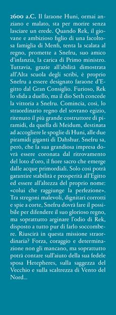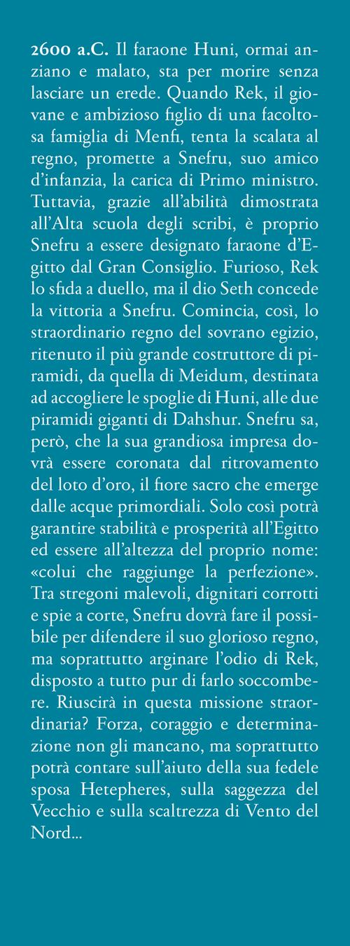 2600 a.C. Il faraone Huni, ormai anziano e malato, sta per morire senza lasciare un erede. Quando Rek, il giovane e ambizioso figlio di una facoltosa famiglia di Menfi, tenta la scalata al regno, promette a Snefru, suo amico d'infanzia, la carica di Primo ministro. Tuttavia, grazie all'abilità dimostrata all'Alta scuola degli scribi, è proprio Snefru a essere designato faraone d'Egitto dal Gran Consiglio. Furioso, Rek lo sfida a duello, ma il dio Seth concede la vittoria a Snefru. Comincia, così, lo straordinario regno del sovrano egizio, ritenuto il più grande costruttore di piramidi, da quella di Meidum, destinata ad accogliere le spoglie di Huni, alle due piramidi giganti di Dahshur. Snefru sa, però, che la sua grandiosa impresa dovrà essere coronata dal ritrovamento del loto d'oro, il fiore sacro che emerge dalle acque primordiali. Solo così potrà garantire stabilità e prosperità all'Egitto ed essere all'altezza del proprio nome: «colui che raggiunge la perfezione». Tra stregoni malevoli, dignitari corrotti e spie a corte, Snefru dovrà fare il possibile per difendere il suo glorioso regno, ma soprattutto arginare l'odio di Rek, disposto a tutto pur di farlo soccombere. Riuscirà in questa missione straordinaria? Forza, coraggio e determinazione non gli mancano, ma soprattutto potrà contare sull'aiuto della sua fedele sposa Hetepheres, sulla saggezza del Vecchio e sulla scaltrezza di Vento del Nord…