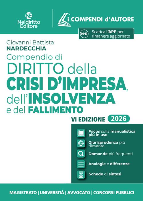 La collana I Compendi d'Autore da circa 20 anni è punto di assoluto riferimento per chi prepara gli esami universitario le prove di abilitazione forense e dei principali concorsi pubblici. A caratterizzare la Collana sono la chiarezza nella forma, la sinteticità abbinata a completezza nella sostanza. Nell' Edizione 2026 veste grafica, struttura e contenuti sono stati profondamente rivisti per rispondere ancor più efficacemente alle esigenze di chi si prepara. Sul piano grafico, box, grassetti, elenchi puntati, rendono lo studio e la memorizzazione assai più agevoli. Numerosi i nuovi contenuti. L'intera trattazione è attentamente ricalibrata tenendo conto delle domande più frequenti negli esami universitari e nelle prove dei principali concorsi pubblici. È riportata e citata in appositi Focus dottrinali la Manualistica più utilizzata nelle Università, così da assicurare una preparazione completa. Si dà inoltre atto in Box giurisprudenziali degli orientamenti interpretativi più rilevanti; Per i principali istituti, sono messe a fuoco in ulteriori Tabelle, le Analogie e le Differenze per una conoscenza sistematica della materia. Per agevolare il ripasso sono, infine, inseriti in chiusura dei capitoli due ulteriori strumenti: le Schede di sintesi , utilissime per consolidare le conoscenze acquisite; le Domande più frequenti, per saggiare la preparazione. Il Compendio di Diritto della Crisi d'Impresa, dell'Insolvenza e del Fallimento tiene conto delle modifiche introdotte dal c.d. Decreto Correttivo ter (D.Lgs. 13 settembre 2024, n. 136)anche alla luce delle più recenti applicazioni giurisprudenziali. Completa il Volume un puntuale Indice analitico.