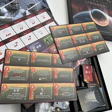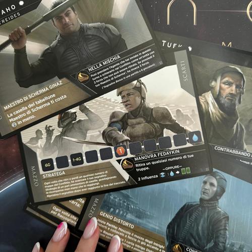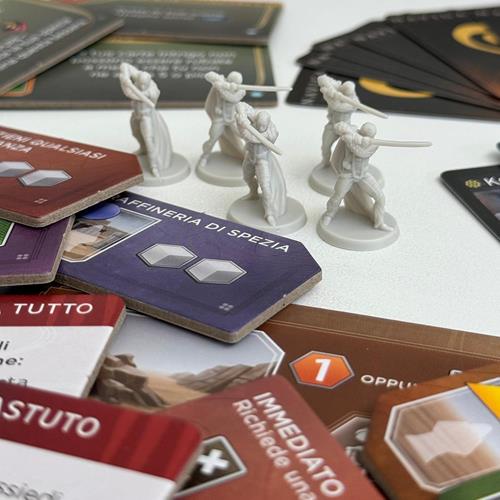 Contenuto: 86 Carte, 9 Leader, 7 Miniature Comandante Sardaukar, 14 Abilità Comandante Sardaukar, 1 Plancia Ambasciata di Ix, 18 Tessere Tecnologia, 8 Contratti, 8 Componenti in Legno, 1 Sietch di Tuek.